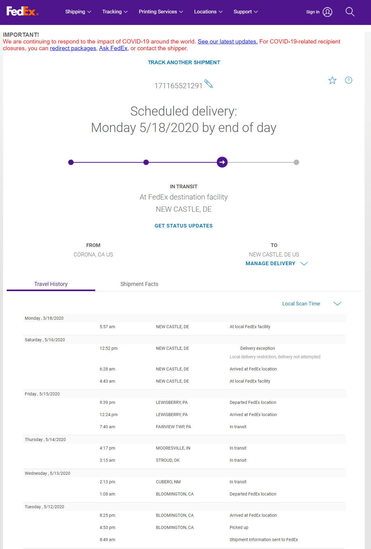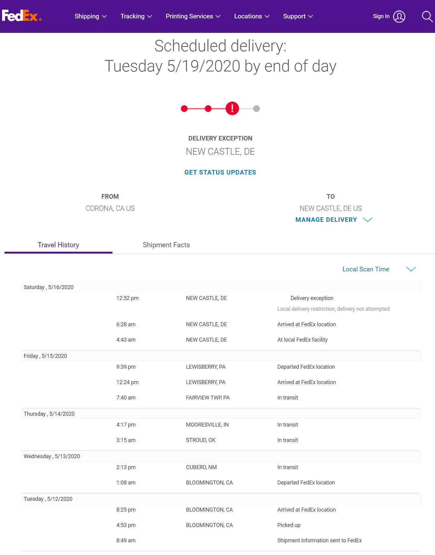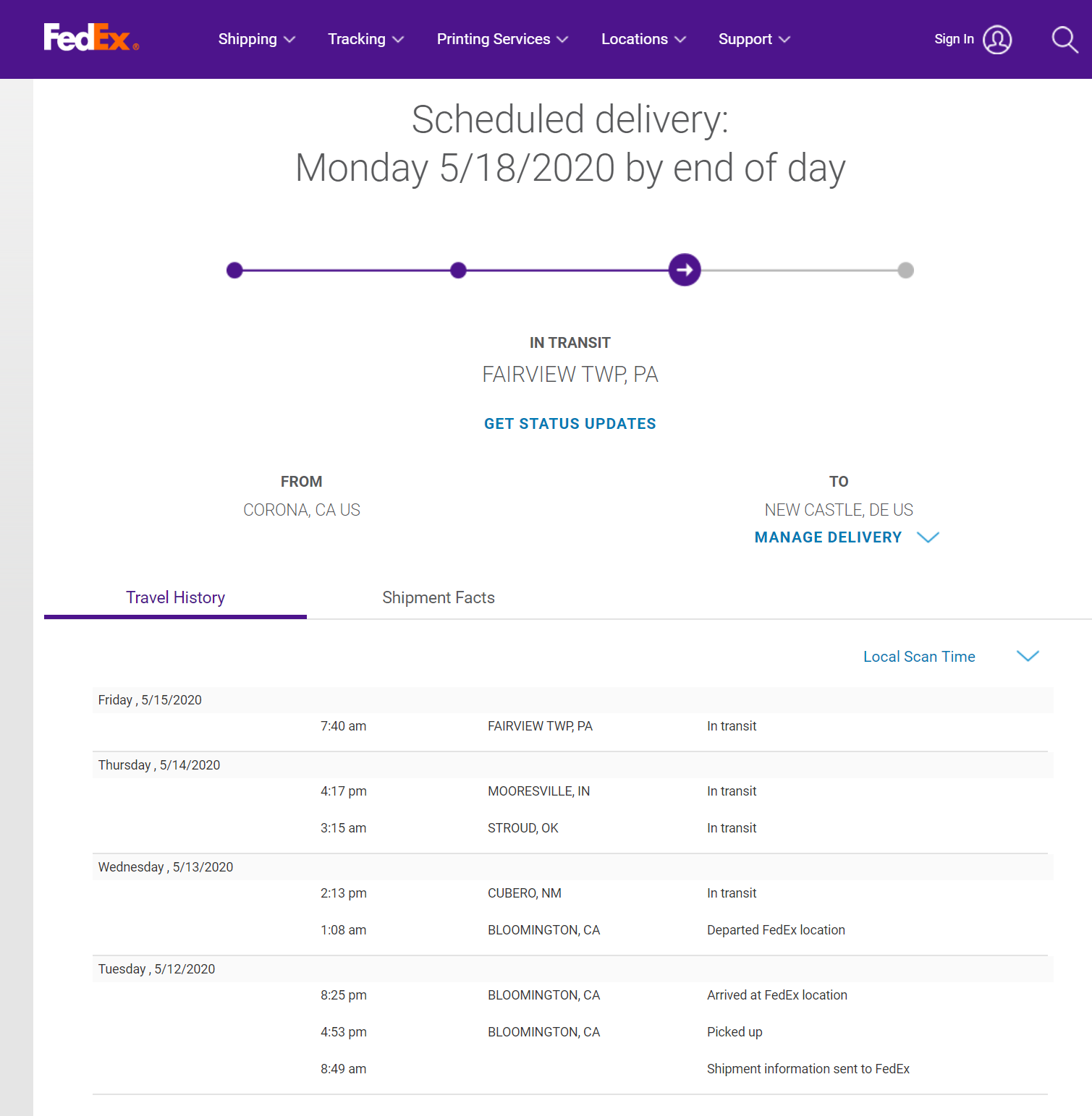 2020.05.19 화요일 도착 예정으로 변경되어 있다.