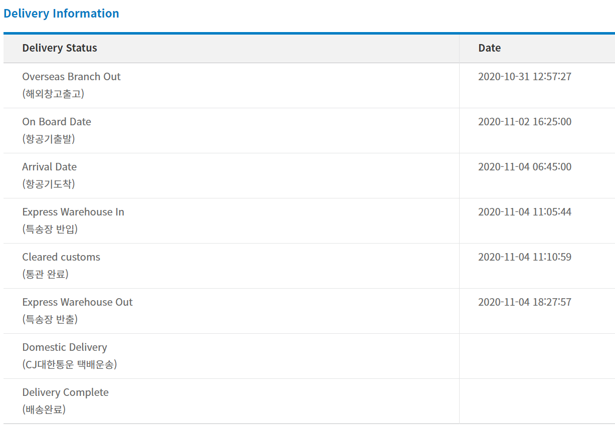 국내 도착 / 통관완료 / 특송장 반출 상태로 조회된다.